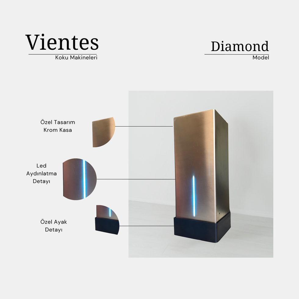 Her detayında kaliteyi hissettiren Vientes Koku Makinesi - Diamond, özel tasarımı ve güçlü performansıyla hem şıklığı hem fonksiyonelliği bir araya getiriyor.